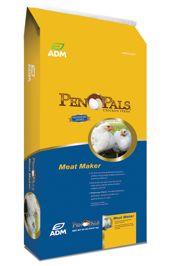 Pen Pals Meat Maker is a highly digestible, 21% protein, 5% fat, complete feed in crumble form formulated for meat birds (broilers, turkeys, ducks, and geese). It contains high-quality grain sources, multiple protein sources, and needed minerals and vitamins to encourage fast, efficient growth of meat birds.